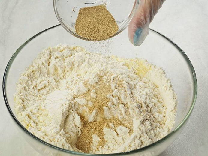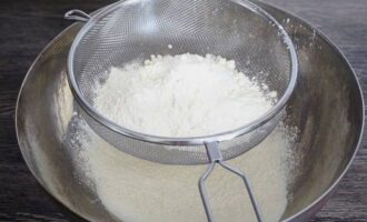 - Zeef de bloem door een zeef. Als de container voor het kneden van het deeg breed genoeg is, kunt u deze er direct in zeven en het deeg geleidelijk roeren.