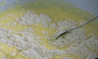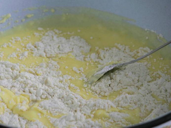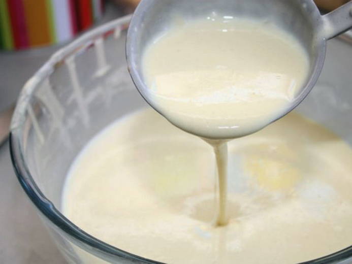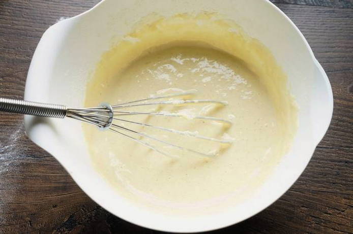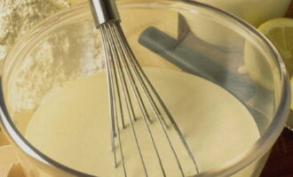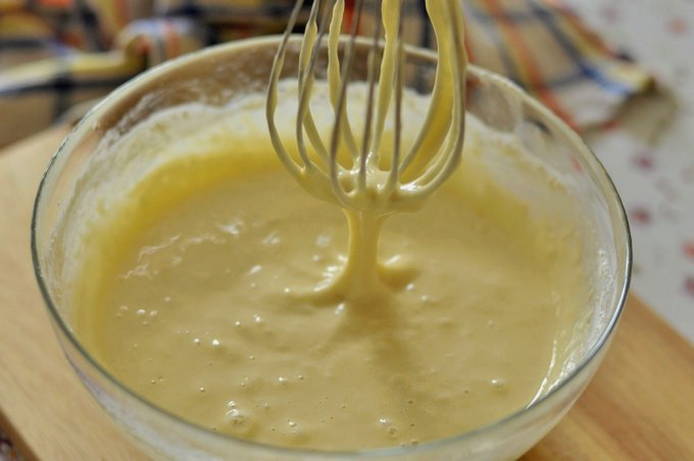 - Zo niet, voeg dan bloem toe aan de vloeibare massa in kleine porties en meng goed, verwijder klontjes.