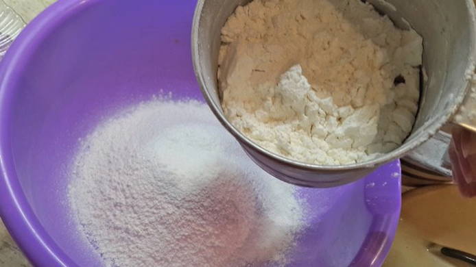 - Zeef het tarwemeel door een zeef, giet er kristalsuiker in.