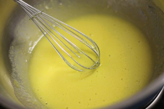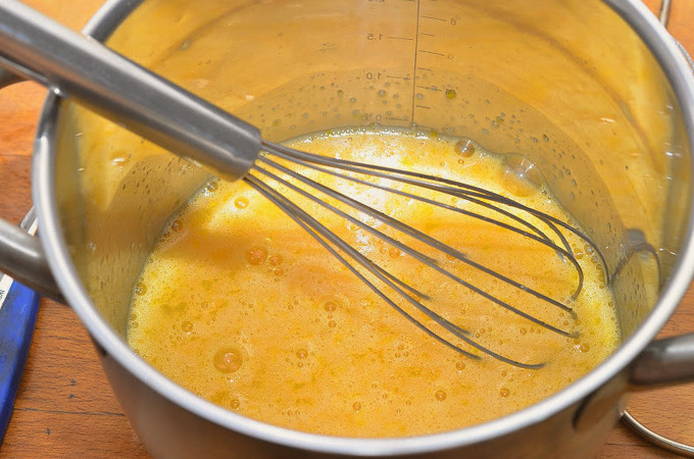 - Breek de eieren in een aparte kom en klop ze met een garde tot schuim.