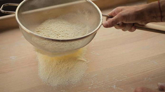 - Zeef de bloem door een zeef om de klontjes te breken en vul het met lucht.
