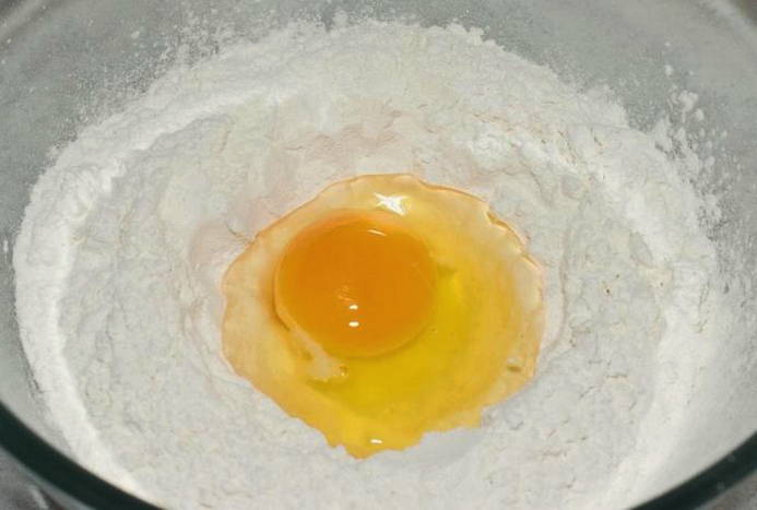 - Voeg er een ei aan toe en giet er geleidelijk water bij.Tegelijkertijd roeren we het deeg constant zodat de bloem niet aan elkaar plakt en er geen klontjes ontstaan.