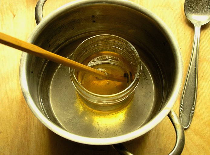 - Als de honing vast is, verwarmen we deze op laag vuur of in een waterbad. We zetten 1 eetl. honing in het deeg en meng.