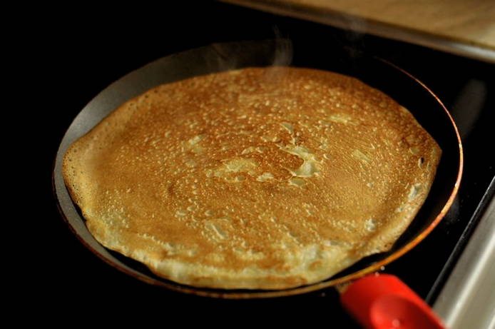 - Verwarm een met plantaardige olie ingevette koekenpan voor en neem ongeveer een halve pollepel deeg voor één pannenkoek. Verdeel het gelijkmatig over de pan en kantel het in verschillende richtingen.