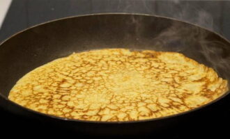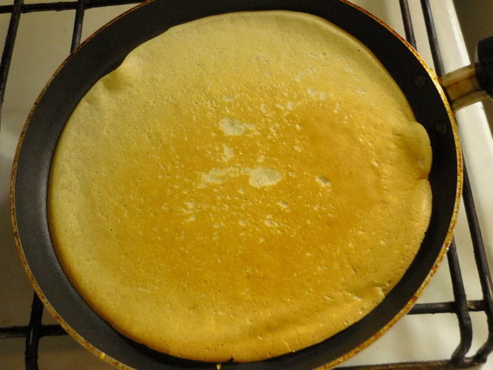 - Bak de pannenkoek aan beide kanten ongeveer 3-4 minuten op middelhoog vuur. Bak alle pannenkoeken op dezelfde manier.