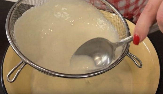 - Nu nemen we een zeef en zeven er bloem doorheen. Dit is nodig om het met lucht te vullen en de pannenkoeken weelderig te maken.