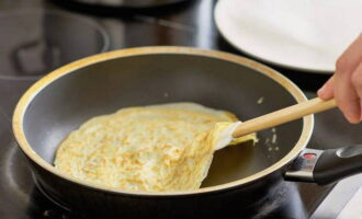We nemen een koekenpan, bestrijken deze met plantaardige olie zodat de pannenkoeken niet verbranden. Voor één pannenkoek heb je iets minder nodig dan een pollepel deeg. Verdeel het deeg over de pan. Om dit te doen, kantelt u het iets naar de zijkanten, zodat het deeg zich kan verspreiden.