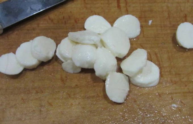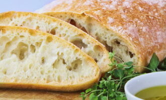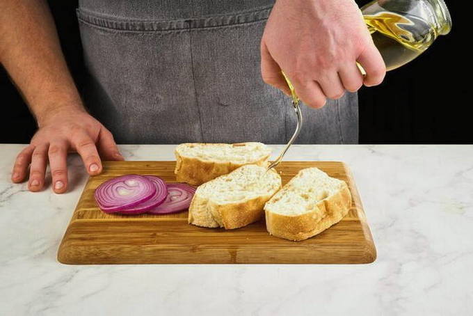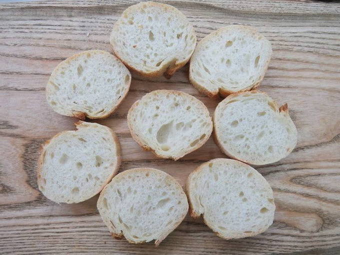 - Het stokbrood wordt schuin in stukken van gemiddelde dikte gesneden, de plakjes worden op een bakplaat gelegd en 5-7 minuten gebakken, besprenkeld met olijfolie.