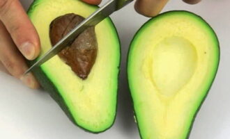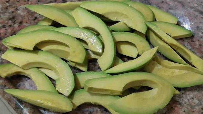 - Verdeel de avocado in stukjes, verwijder de schil en snijd in zeer dunne plakjes. Besprenkel het product met citroensap om te voorkomen dat het product donker wordt.