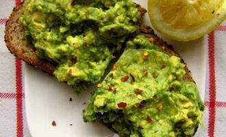 Voeg citroensap, een beetje olijfolie en versgemalen zwarte peper toe aan de massa van de avocado.