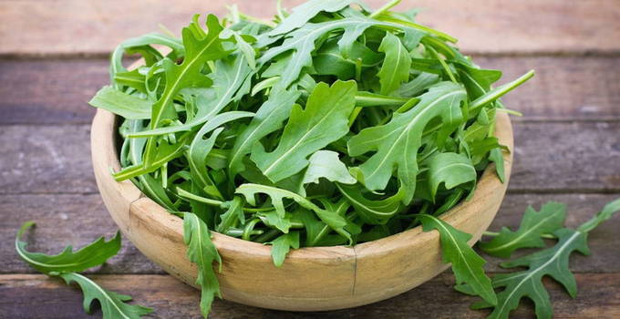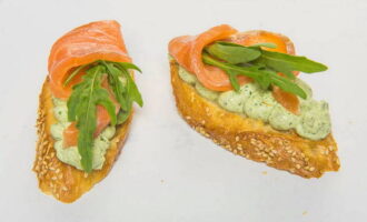 - Leg een plakje vis op het brood met kaas, verdeel de rucola erover.