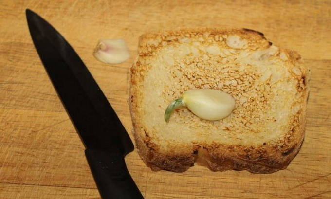 - Snijd het stokbrood in plakjes, waarvan de dikte 1,5 cm moet zijn, en houd een minuut aan elke kant vast zonder olie. Wrijf het brood in met 1 teentje knoflook.