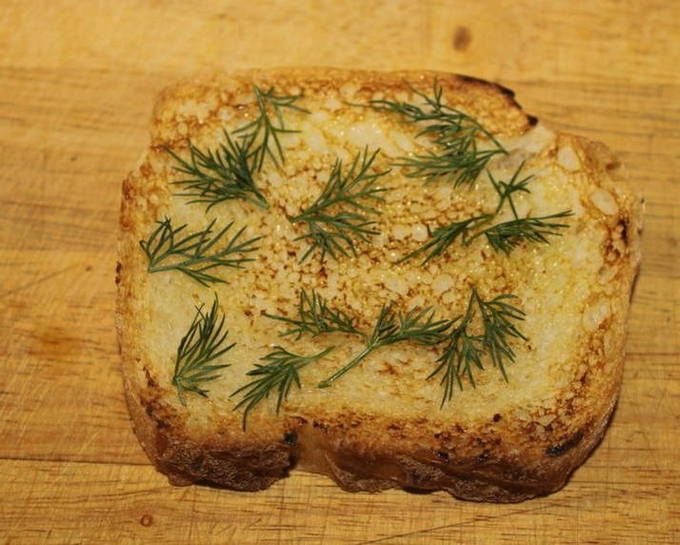 - Verwarm de besprenkelde sneetjes brood in een droge koekenpan. Je kunt ze een paar minuten vasthouden tot ze knapperig en rossig worden.