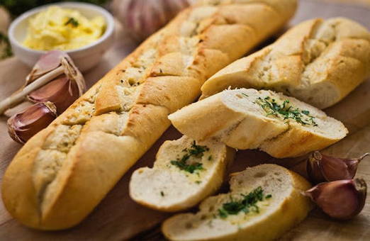 - Besprenkel het brood licht met boter en bak het in de oven tot het lichtbruin is en wrijf het dan aan beide kanten in met knoflook.