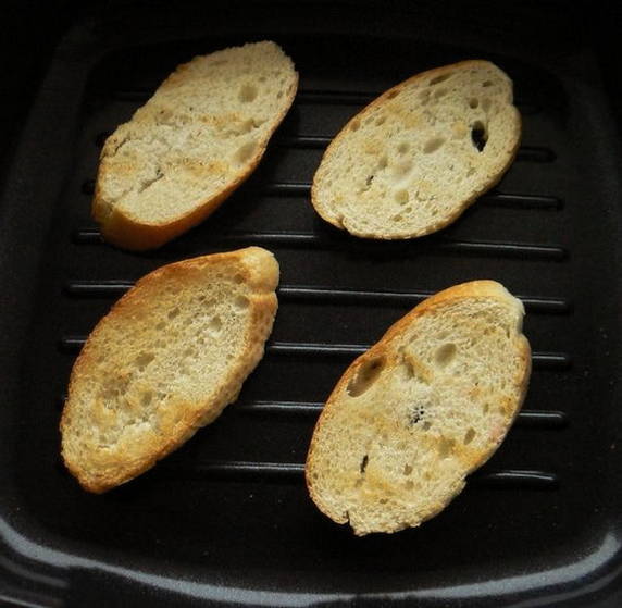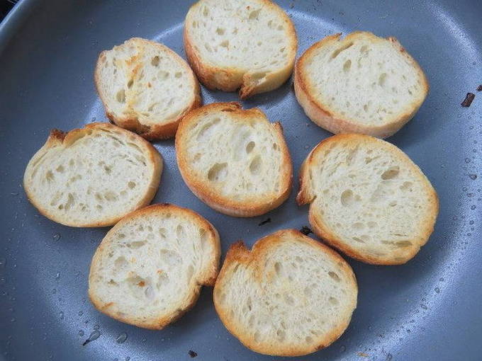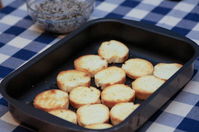 - Snijd de baguette in vrij dunne plakjes, besprenkel met olie en bak ze in de oven op middelhoog vuur in ongeveer 8 minuten lichtbruin. Haal ze eruit en laat afkoelen.