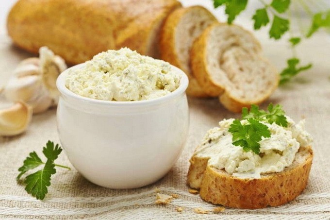 - Meng twee soorten kaas in een blender, voeg een lepel mayonaise, gehakte knoflook, een beetje zout, peper en gehakte groene uien toe. Laat wat uien over om de bruschetta's te versieren.