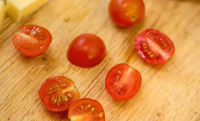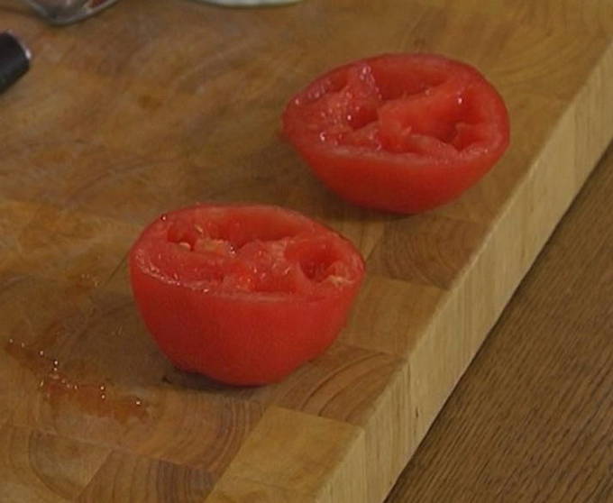 - Snijd de tomaat doormidden, verwijder de zaadjes, leg op aluminiumfolie, besprenkel met olie, breng op smaak met zout en peper en bak 15 minuten.