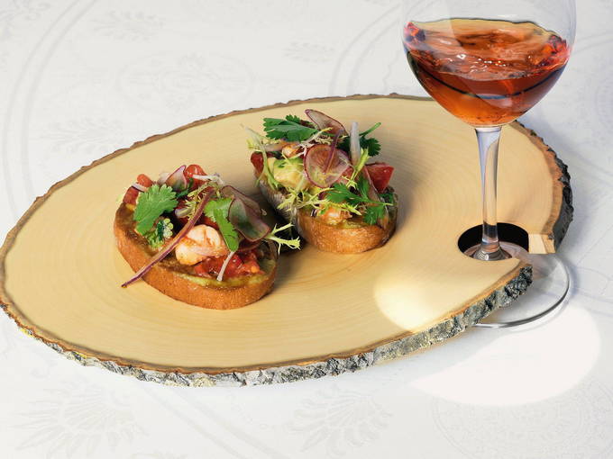 - Leg de garnalen met tomaten, fetakaas op de stukjes stokbrood, hak ze op de vulling en serveer.