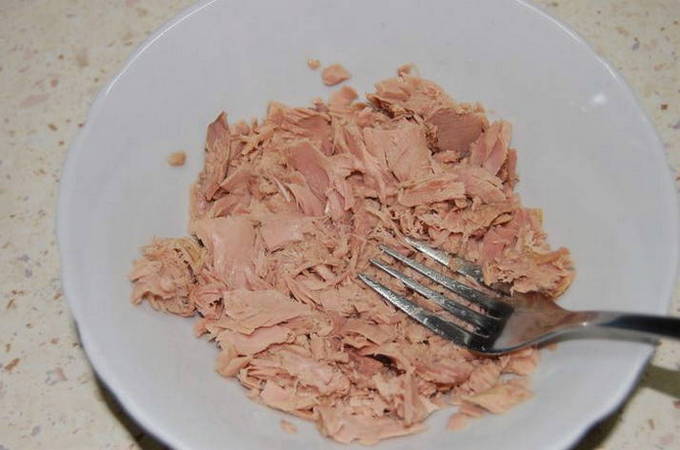 - Prak voor de vulling de tonijn fijn met een vork en meng met het tweede fijngehakte teentje knoflook.
