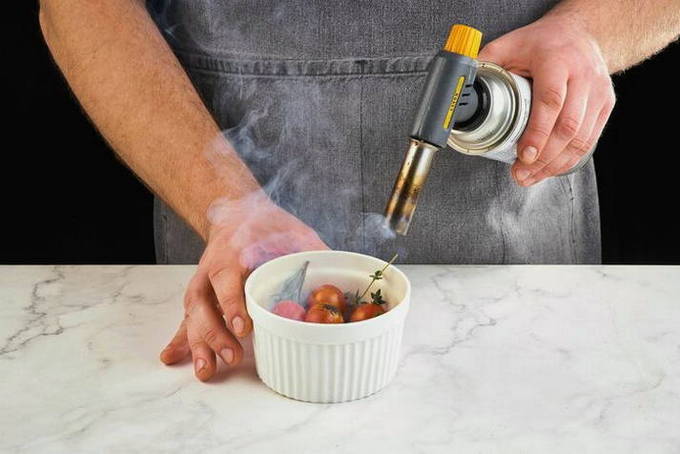 - Wikkel de cherrytomaatjes in folie met tijm en rozemarijn, plaats 5-7 minuten in de oven of verbrand ze met een brander.