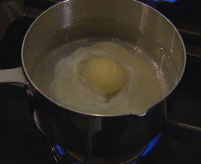 - Bereid in water met toevoeging van azijn een gepocheerd ei: breek het ei in een trechter met kokend water, kook 2-3 minuten op laag vuur en verwijder het eindproduct met een schuimspaan op een papieren handdoek.