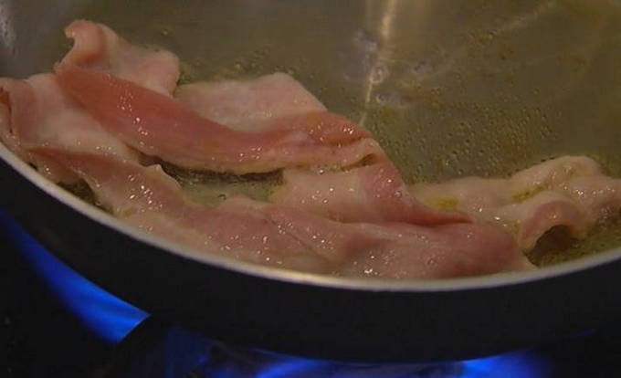 - Bak de plakjes spek bruin in boter, leg op een servet om overtollig vet te verwijderen.