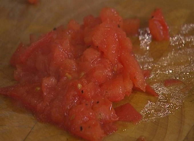 - Snijd de tomaten in grote blokjes, hak de groene olijven heel fijn. Combineer plakjes tomaat en olijven met tomatenpuree.