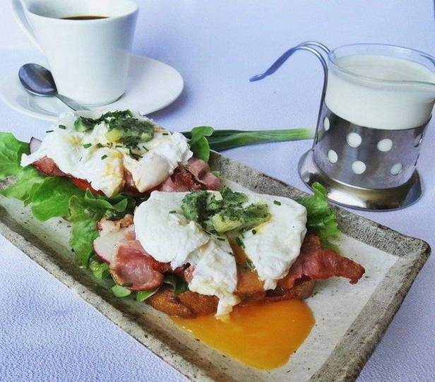 - Doe de tomatenmassa, het gepocheerde ei op geroosterd brood in een broodrooster en snijd het zo dat de dooier eruit begint te stromen. Top met geroosterde plakjes spek en gehakte peterselie. Eet smakelijk!