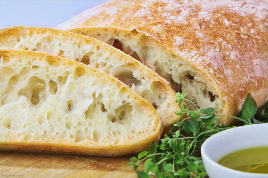 - Snijd de ciabatta in stukjes, besprenkel met olijfolie en droog ze in een droge koekenpan of grill.