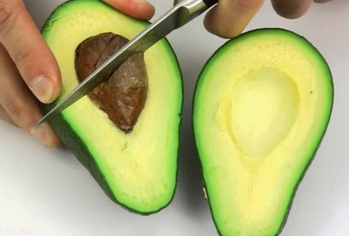 - Verdeel de avocado in stukjes, verwijder de schil en snijd in zeer dunne plakjes. Besprenkel het product met citroensap om te voorkomen dat het product donker wordt.
