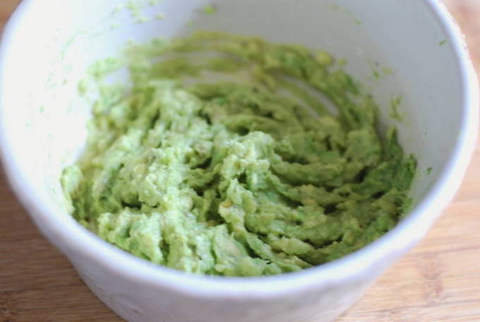 Snijd de avocado doormidden, verwijder het vruchtvlees en prak het met een vork tot puree.