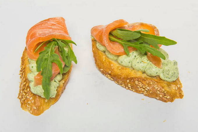 - Leg een plakje vis op het brood met kaas, verdeel de rucola erover.