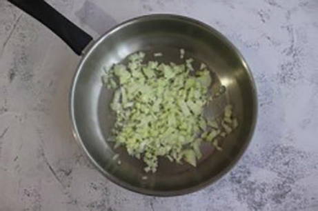 - Pel de uien, hak ze fijn en fruit ze in olijfolie tot ze transparant zijn. Breng de ui over naar een pan waar de saus zal worden bereid.