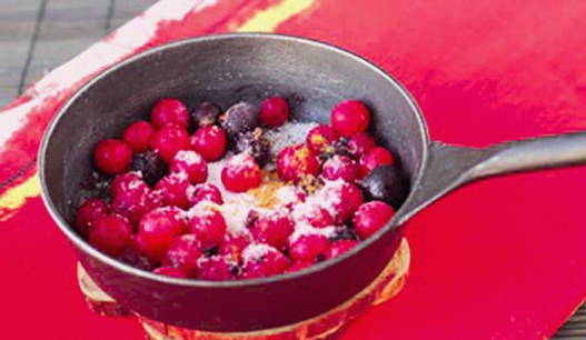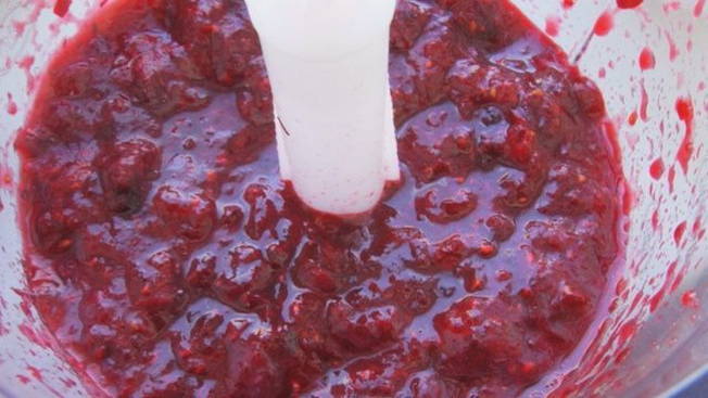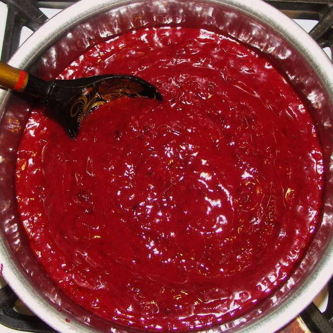 - Terwijl u de inhoud van de pan verwarmt, plet u de bessen met een oogje. Roer de saus door en laat een paar minuten sudderen.