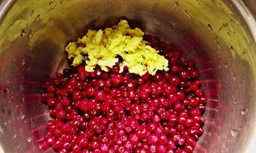 - Meng in een pan rode bosbessenpuree, suiker, kaneel, gemalen gember, kruidnagel, sinaasappelschil en sap.