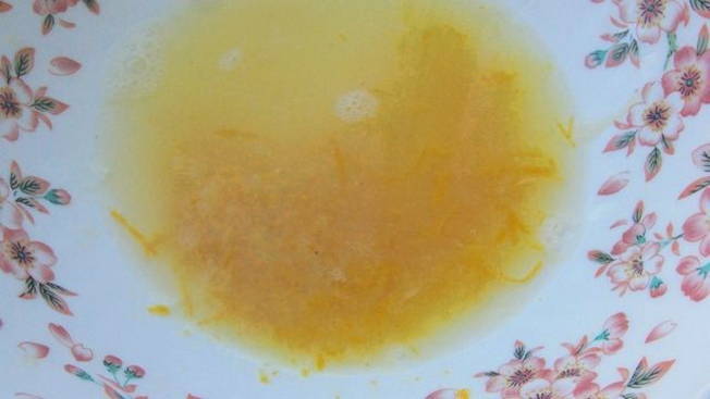 - Giet kokend water over de sinaasappel, was goed en droog. Rasp de schil op een fijne rasp en pers het sap uit de sinaasappel.