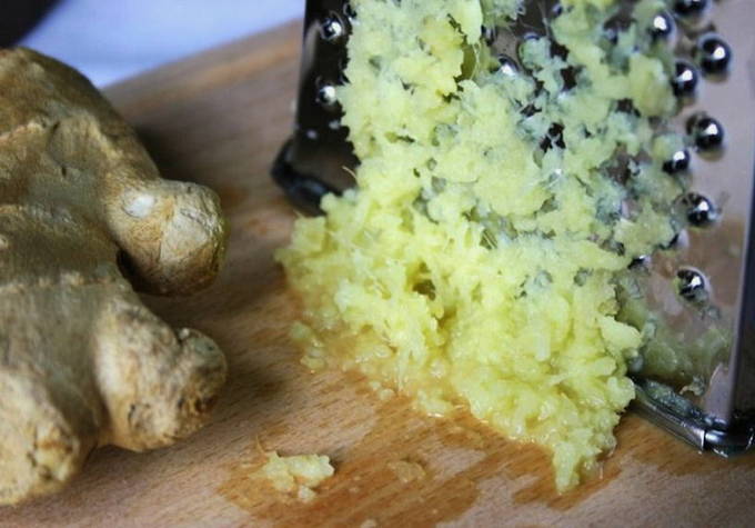 - Schil de gember van de bovenste laag, rasp op een fijne rasp en voeg toe aan de saus, kook nog 2-3 minuten en haal dan de pan van het vuur.