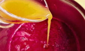 Voeg sinaasappelsap toe aan de bosbessenmassa, roer.