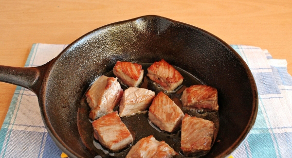 - Was het varkensvlees en snij in blokjes. Leg het vlees op de boter in een pan.