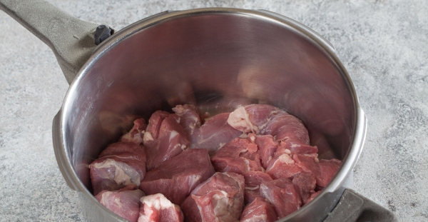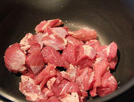 - Was het vlees, dep het met keukenpapier en snijd het in grote stukken. Doe het vlees in een pan.