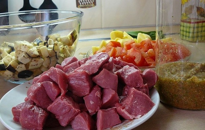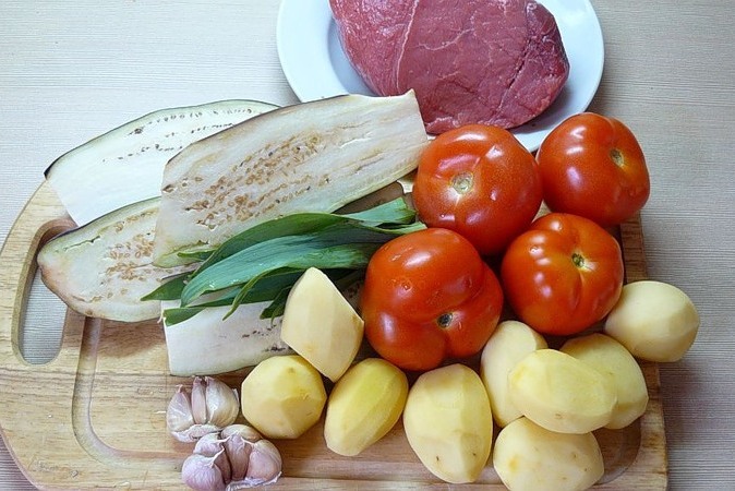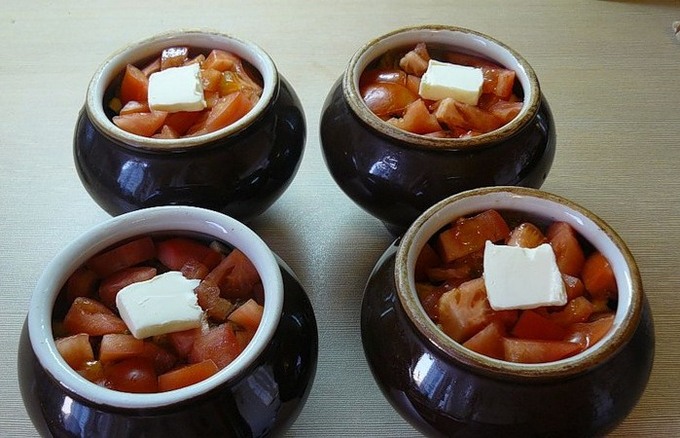 - Snijd aardappelen, aubergines, tomaten en uien in kleine blokjes. Doe vlees in potten, dan uien, aardappelen, aubergines en tomaten. Leg er een klontje boter op.