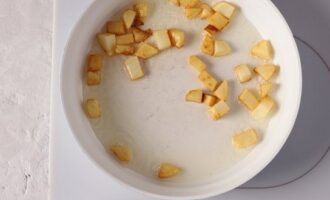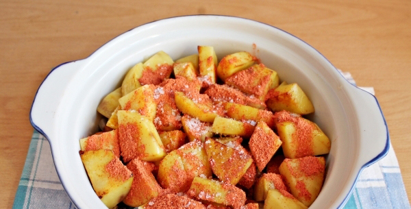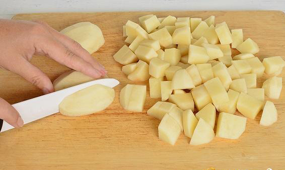 - Schil de aardappelen, was ze, snijd ze in blokjes en bak ze 2-3 minuten in plantaardige olie.