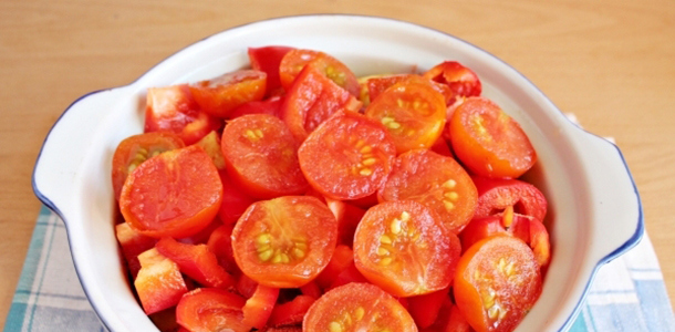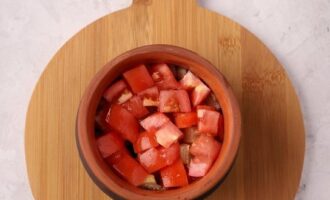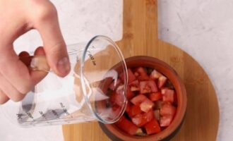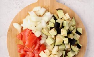 - Schil de aubergines, snijd ze in blokjes en doe ze in een kom. Haal de knoflook door een pers, voeg deze toe aan de andere ingrediënten. Doe de tomaten in hun eigen sap, giet er een beetje water bij.