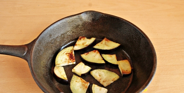 - Was de aubergines, snijd ze in stukken en bak ze in een minimale hoeveelheid olie.