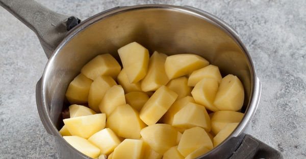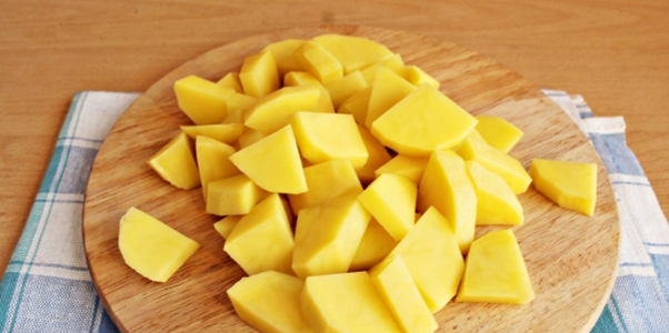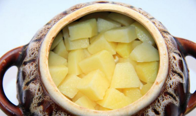 - Schil de aardappelen, was ze, snijd ze in blokjes en leg ze op de bodem van de aarden potten.