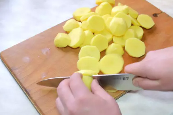 - Leg vervolgens de gesneden aardappelen neer.