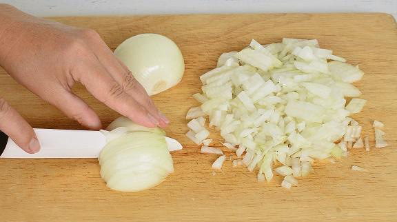 - Haal de schil van de ui en hak hem fijn.