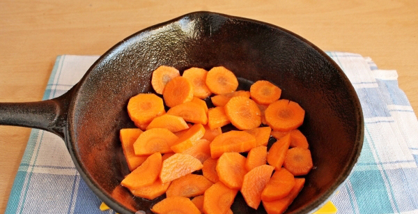 - Schil de wortel, was en snijd in plakjes. Bak de wortelen in plantaardige olie.
