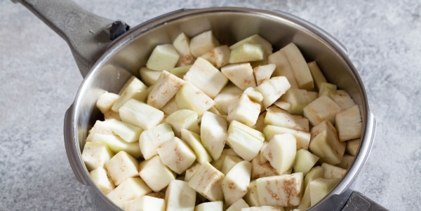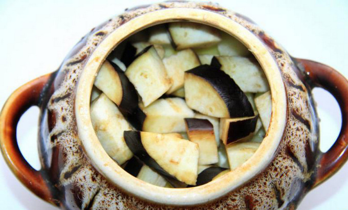 - Snijd de aubergine in blokjes en doe ze ook in potten.