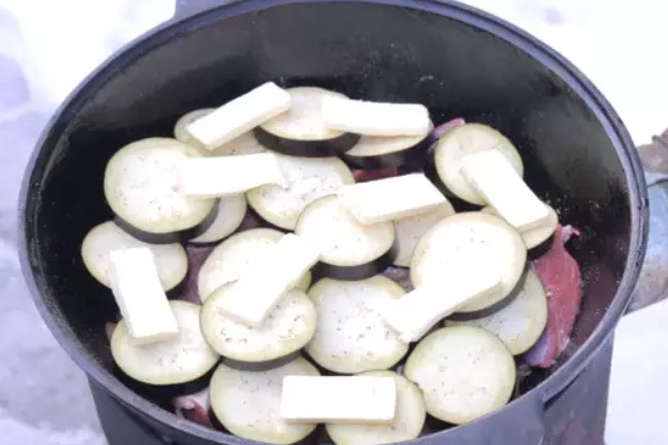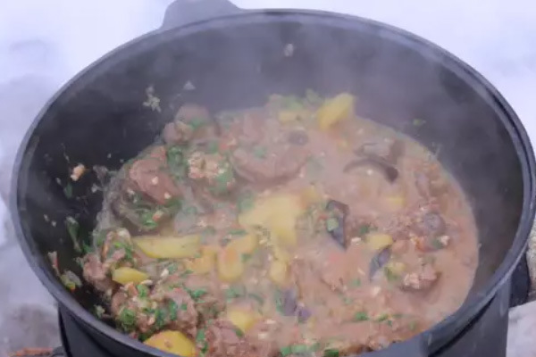 - Doe aardappelen en uien in een ketel, voeg zout, komijn, gemalen koriander en suneli-hop toe. Roer de groenten en leg het lamsvlees erop, zout en breng op smaak. Leg aubergine en boter op het vlees. Sluit de ketel en kook op middelhoog vuur gedurende 1 uur.
